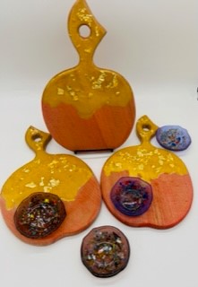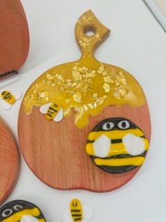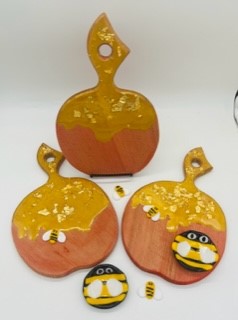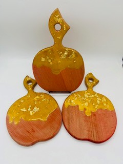 This fabulous Apple shaped wooden cutting board was decorated with resin to resemble honey. It's a perfect, festive way use as a chartcuterie too displaying apples & honey for a Sweet New Year!