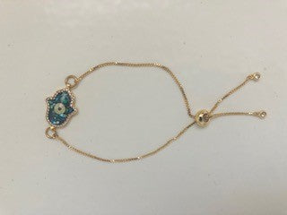 This gorgeous Hamsa charm is made of mother of pearl (also available in Mosaic design w/ gold chain) attached to an easy sliding clasp which adjusts the chain to fit your wrist. You will have luck wearing this bracelet as well as showing off your unique style.