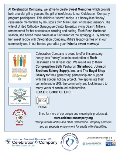 At Celebration Company, we strive to create Sweet Memories which provide both a useful gift to you and the gift of usefulness to our Celebration Company program participants. This delicious "secret" recipe is a honey-less "Honeycake" made memorable by Houston's own Millie Dean, of blessed memory. The wife of United Orthodox Synagogue Cantor Emeritus Irving Dean (z"l), Millie is remembered for her spectacular cooking and baking. Each Rosh Hashanah season, she baked these cakes as a fundraiser for the synagogue. By sharing her sweet recipe with Celebration Company, Millie's legacy carries on in our community and in our homes year after year. What a sweet memory!